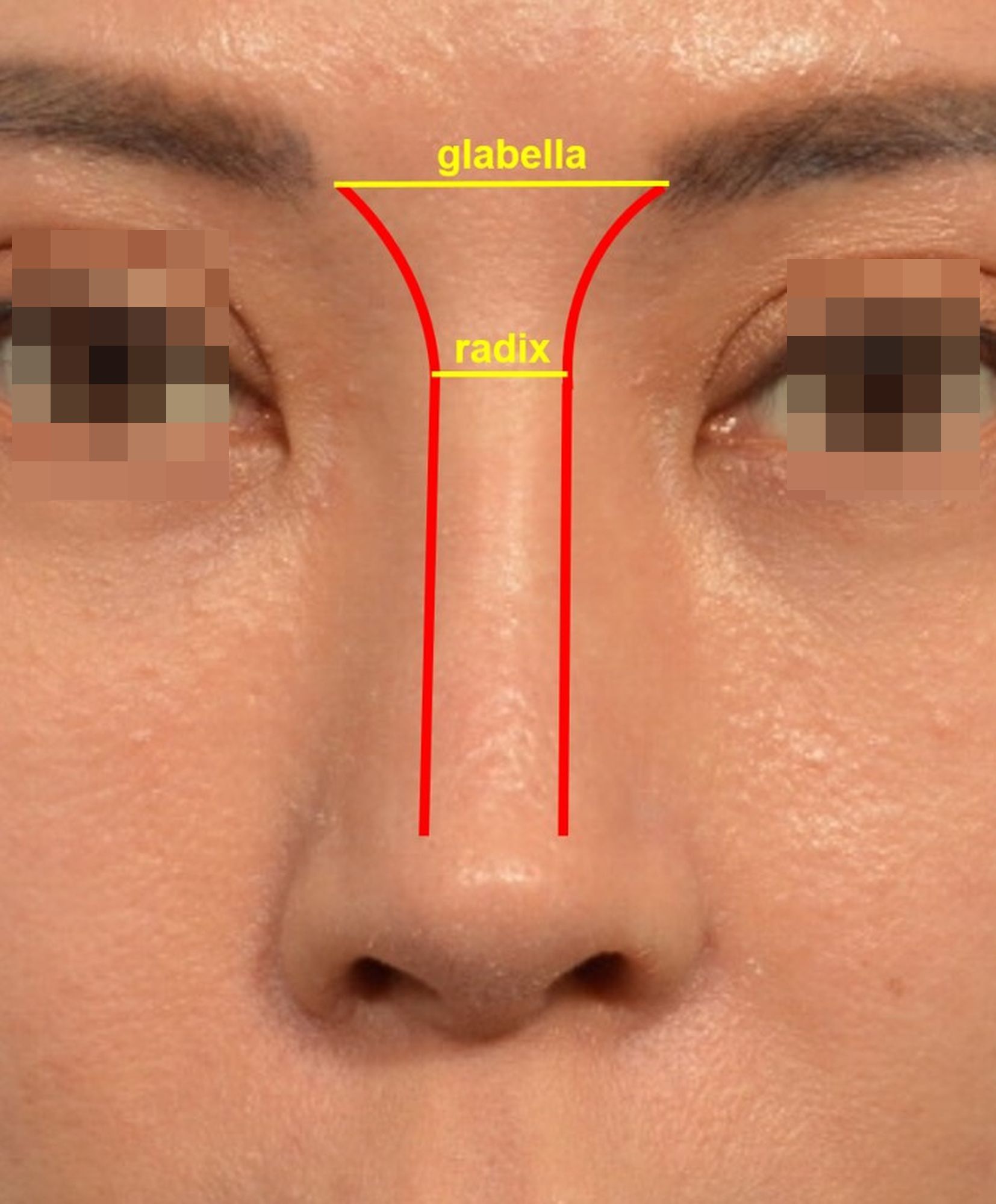 眉心到鼻樑的協調美學曲線(brow-tip aesthetic lines)的扭曲不順,額-鼻角變成尖銳突兀。