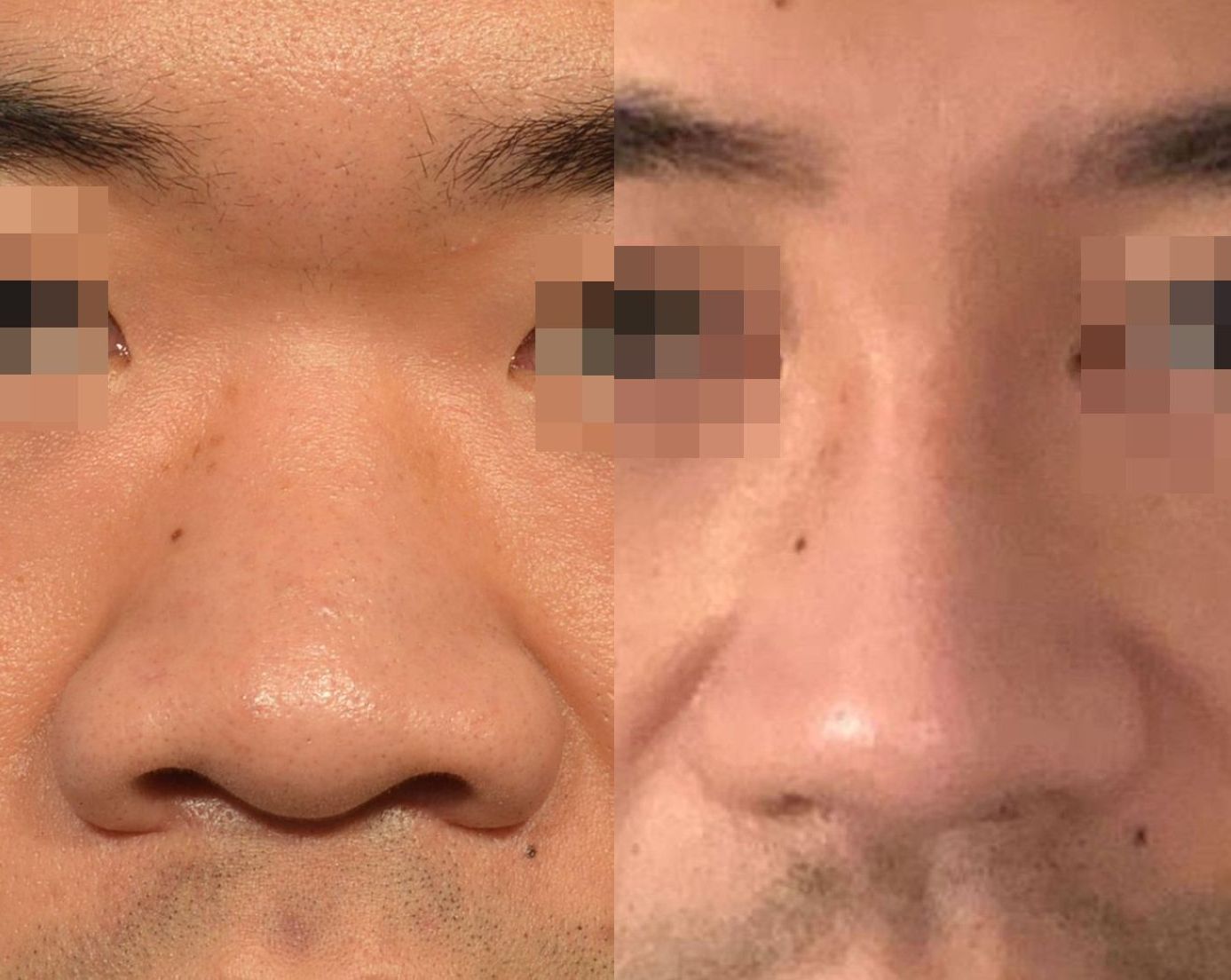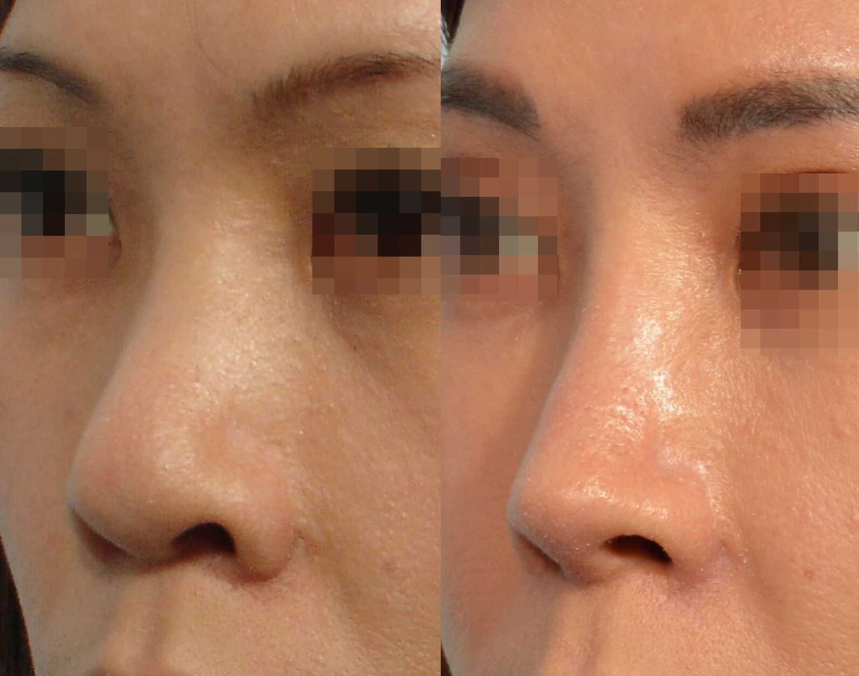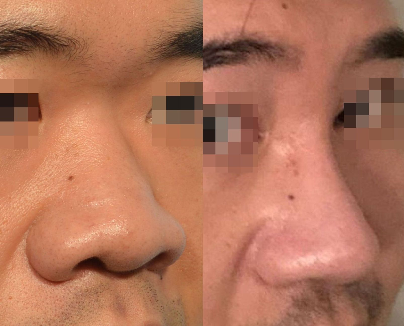眉心到鼻樑的協調美學曲線(brow-tip aesthetic lines)的扭曲不順,額-鼻角變成尖銳突兀。破壞鼻形整體美感。