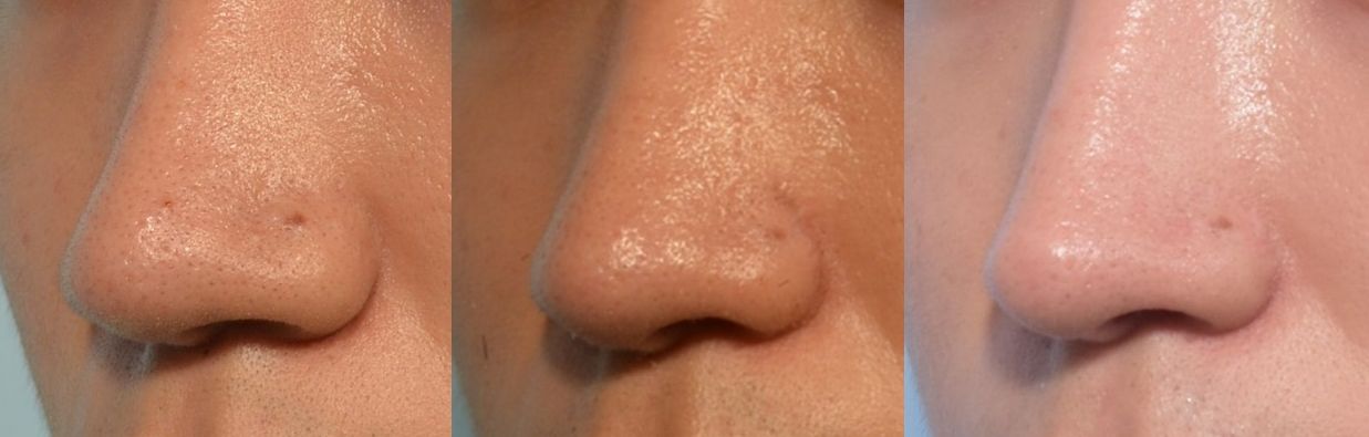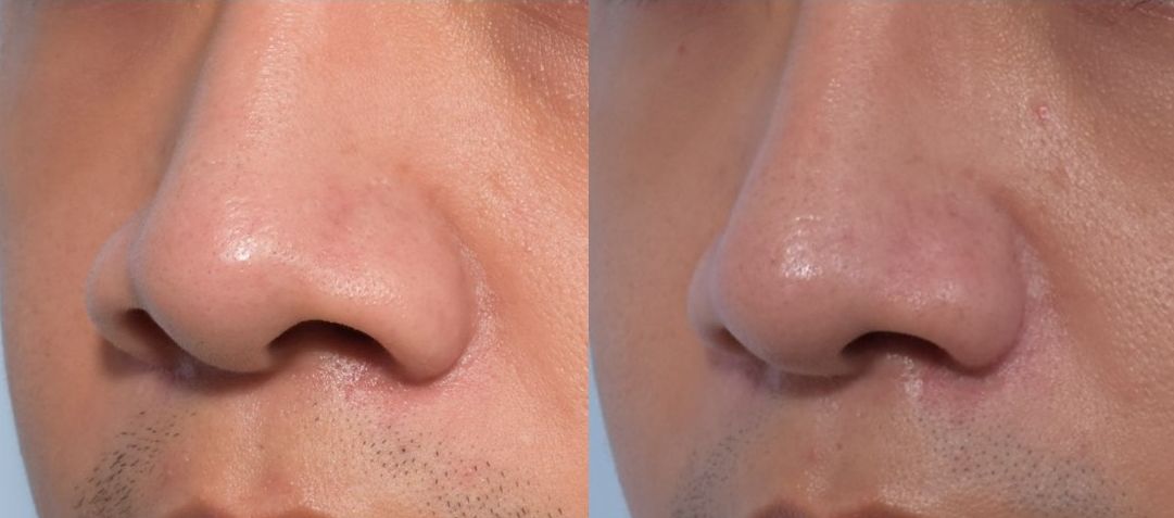 鼻翼大略分為外切與內切,但是不管如何,有切必有疤,請不要以為內切就一定沒疤,外切疤痕就一定很明顯。切鼻翼,說穿了其實就是沿著鼻翼底座切掉一部分的皮膚和組織,有時還會包含鼻孔邊緣的皮膚,每個醫師的手法有些許差異。而術後恢復到底疤痕會不會明顯,除了醫師的縫合技巧外,跟每個人在鼻翼處容不容易長粉刺痘痘也有很大的關係,如果本來就有很多黑頭粉刺在鼻翼處的人,確實跟鼻翼沒甚麼黑頭粉刺的人相比,疤痕會稍明顯。下圖為粉刺較多的: 切鼻翼術前 / 術後兩個月仍有色素沉澱 / 術後兩年